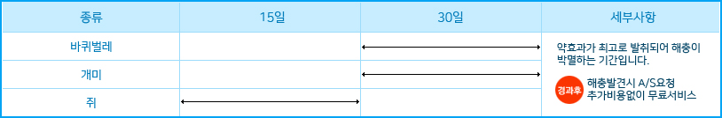 고객님댁의 바퀴벌레/개비/쥐를 완전히 퇴치하기 위해서는 바퀴벌레 30일, 개미 30일, 쥐 15일 박멸되는 기간이 소요됩니다.